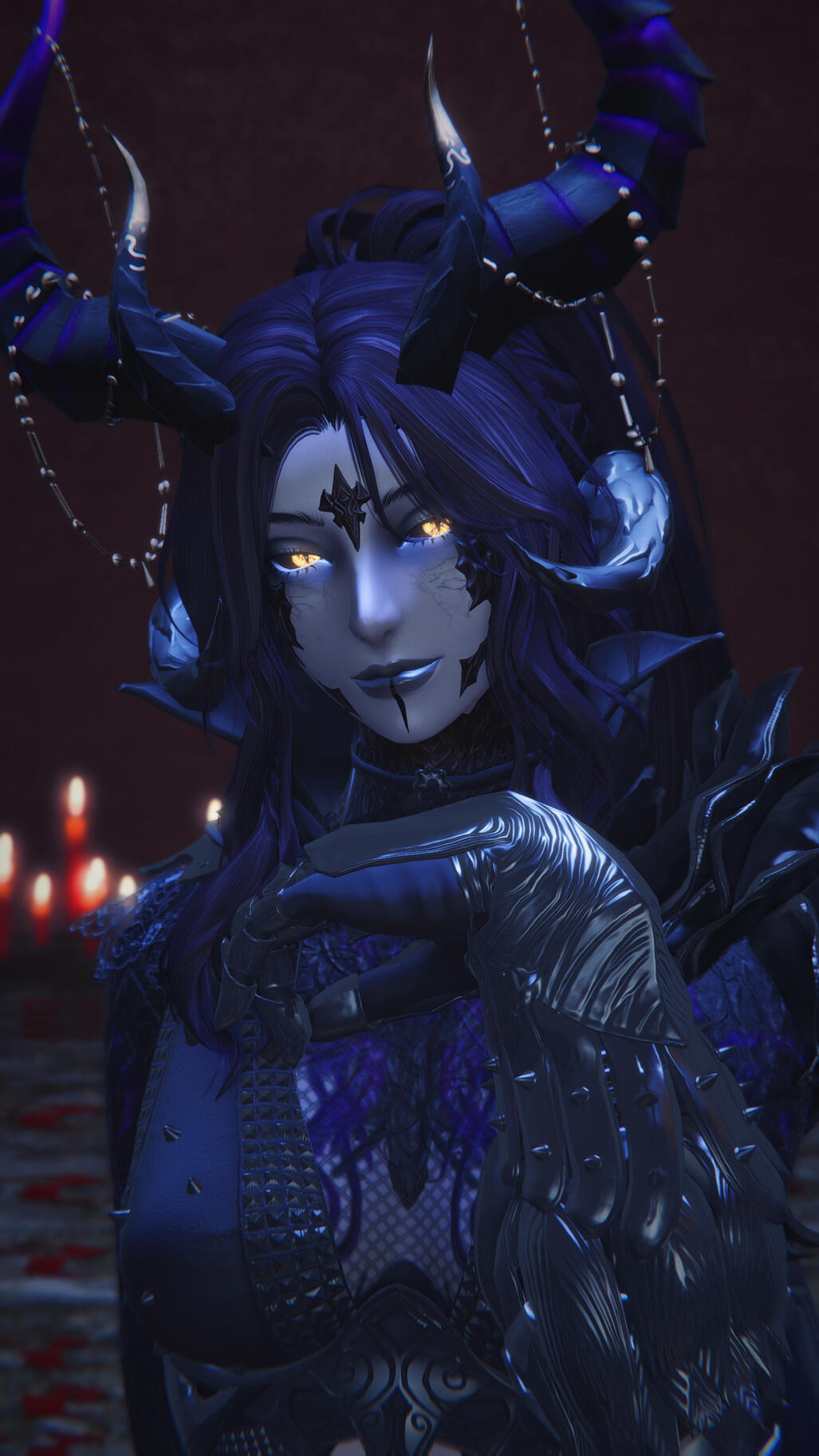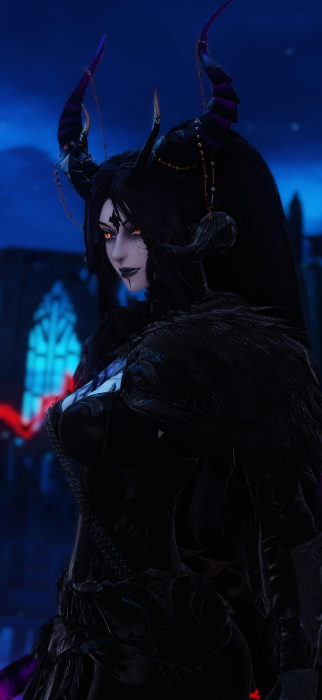 Overtime as Fuyuko embraced more of the Void's power, her appearance began to change. White scales darkened and tanned complexion grayed. In death and having spent the past few years in the Void, she hardly bears any resemblance to who she once was. Several horns protrude from her head with a latent purple glow. Sclera now darkened and piercing orange eyes. Darkened veins all around her body and most concentrated around her eyes go to show how much her body chemistry has altered.She walks with purpose, with every step she takes it's like there's a force behind it. Yet when she jumps or floats down, it seems so gentle. Her voice cuts deep and with exuding confidence.